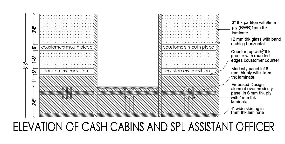 The bank cash cabin and assistant office cabin front elevation design that shows customers mouth piece, customers transition window, 12 mm thk glass with band etching horizontal, Modesty panel in18 mm thk ply with 1mm thk laminate and 4" wide skirting in 1mm thk laminate detail in dwg file. Thank you so much for Downloading AutoCAD DWG 2d files from our website.