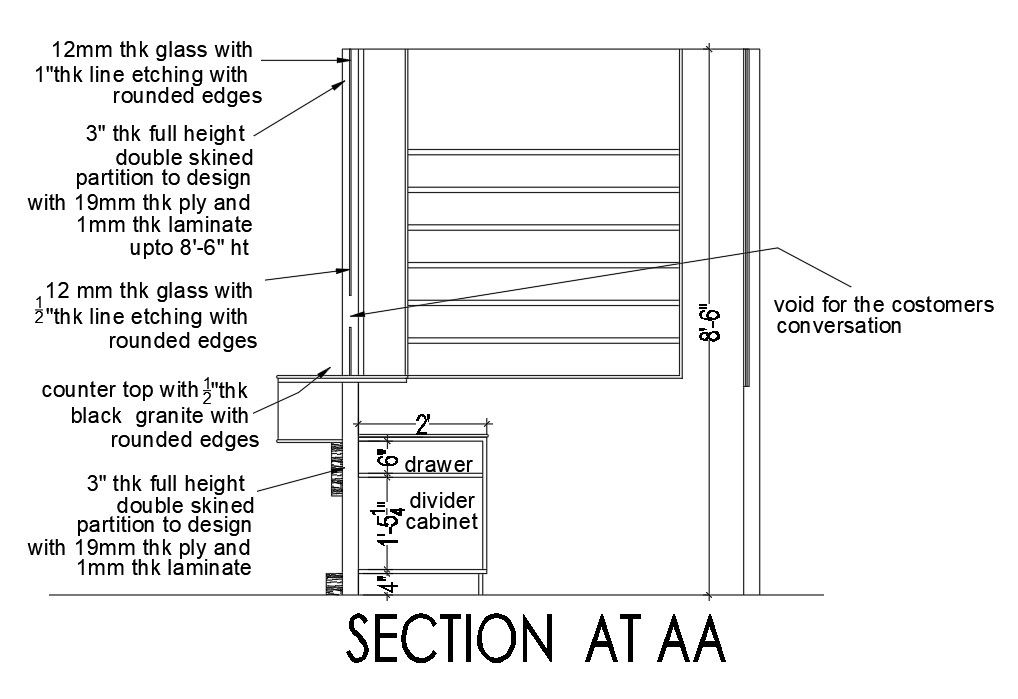 The bank office cabin side section AutoCAD drawing which consist 12mm thk glass with 1"thk line etching with rounded edges, 3" thk full height double skinned partition to design with 19mm thk ply and 1mm thk laminate detail in dwg file. Thank you so much for Downloading AutoCAD DWG 2d files from our website.