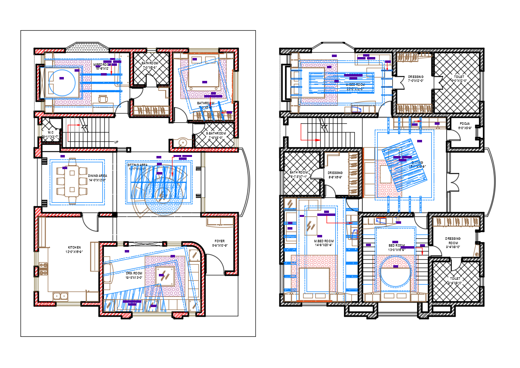 The architecture space planning for house ground floor and first floor for 55'X65' plot size which consists modular kitchen, dining room, seating area, drawing room, 5 bedrooms, foyer area, and inside staircase with interior false ceiling design and furniture layout plan drawing in dwg file. Thank you for downloading the AutoCAD drawing file and other CAD program files from our website.