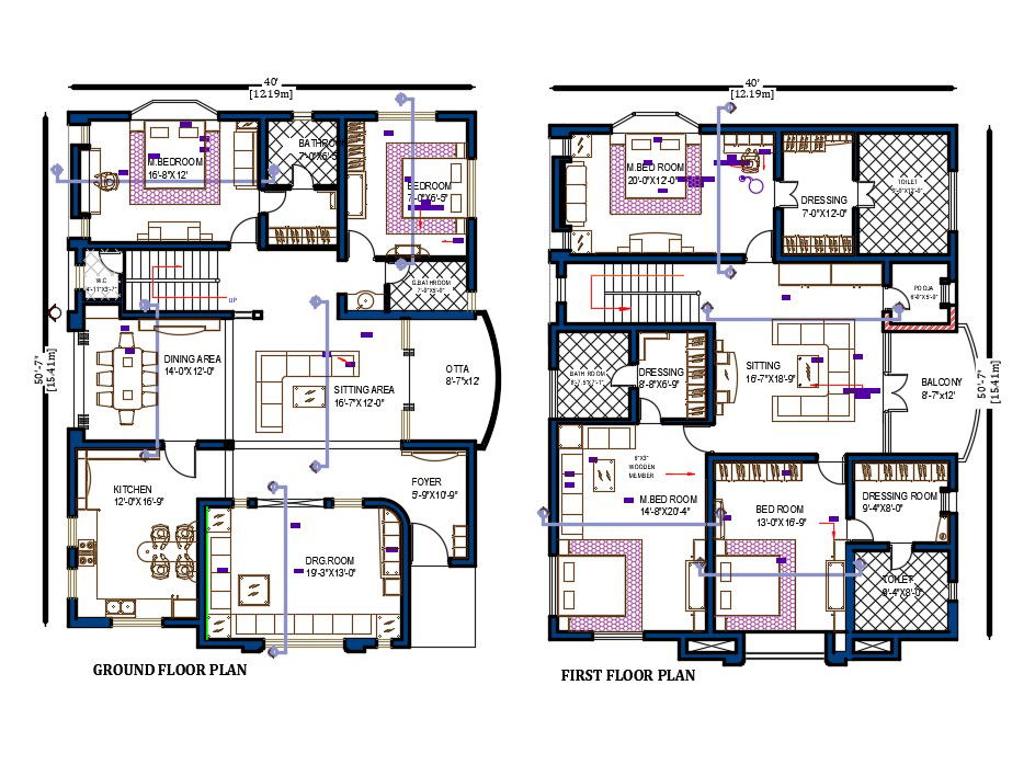 The architecture space planning for house ground floor and first floor for 40X50 plot size which consists modular kitchen, dining room, seating area, drawing room, 5 master bedrooms with dressing room, balcony, pray room, foyer area, and inside staircase with interior furniture layout plan drawing in dwg file. download 2000 square feet plot size complete house plan drawing in DWG file.