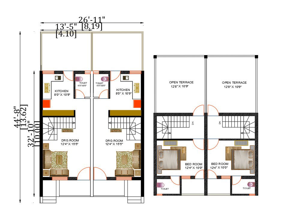 The twin house ground floor and first floor plan AutoCAD drawing that shows 13X44 feet plot size which includes 1 master bedrooms with an attached toilet, drawing room, kitchen, and open terrace. also has furniture design and dimension detail in dwg file. Thank you for downloading the AutoCAD drawing file and other CAD program files from our website.
