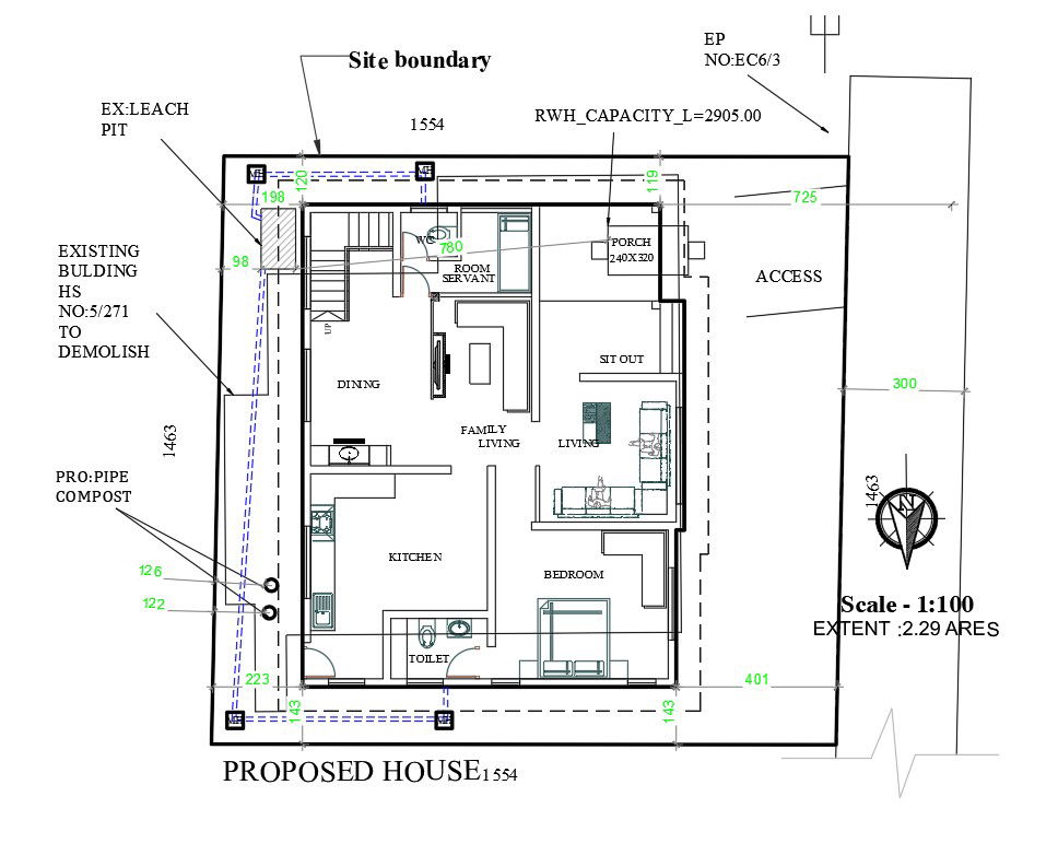 the architecture residence house ground plan CAD drawing which consist Exi Building area to demolish = 111.77 Sqm with all furniture detail and gutter line chamber box which is goes to existing drainage network with chamber box and sanitary ware detail dwg file. thank you for downloading the Autocad drawing file and other CAD program files from our website.