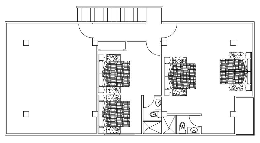 The bedrooms first floor plan AutoCAD drawing that shows 2 bedrooms with an attached toilet, double bed with side corner, column layout, sanitary ware detail in dwg file. Thank you for downloading the AutoCAD drawing file and other CAD program files from our website.