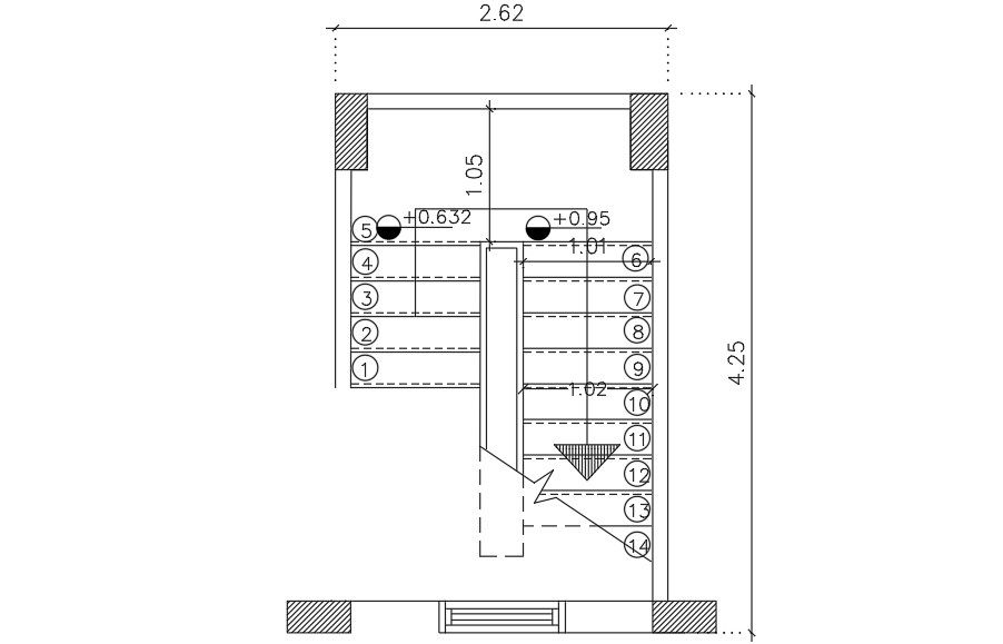 The staircase simply plan AutoCAD drawing includes 2.62X4.25 meter size with step calculate tread and riser, RCC column and measurement detail. the many municipalities will adopt a model building code and modify it to suit their particular needs. Thank you for downloading the AutoCAD drawing file and other CAD program files from our website.