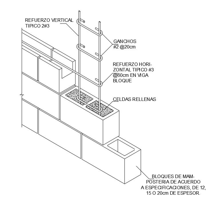 The wall structure CAD blocks drawing shows typical vertical reinforcement 2 hooks 20cm, typical horizontal reinforcement 60cm in block beam, filled cells, posterior breast blocks according to specifications, 12, and 15 or 20cm thick detail in dwg file. Thank you for downloading the AutoCAD drawing file and other CAD program files from our website.