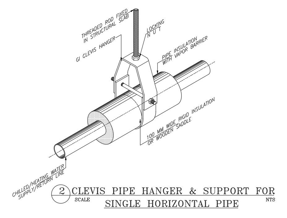 The autocad drawing of 2 clevis pipe hanger & support for single horizontal pipe, 100 mm wide rigid insulation or wooden saddle, chilled/heating water supply/return line, threaded rod fixed in structural slab, gi clevis hanger, pipe insulation with vapor barrier