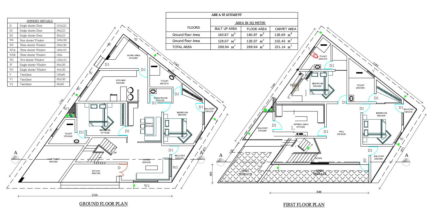 The architecture bungalow house ground floor and first floor plan CAD drawing includes door and window schedule, built up area, floor area and carpet area detail in squire meter format. there is total 288 SQM plot size with dimension and all furniture layout plan design in dwg file. Thank you for downloading the AutoCAD drawing file and other CAD program files from our website.