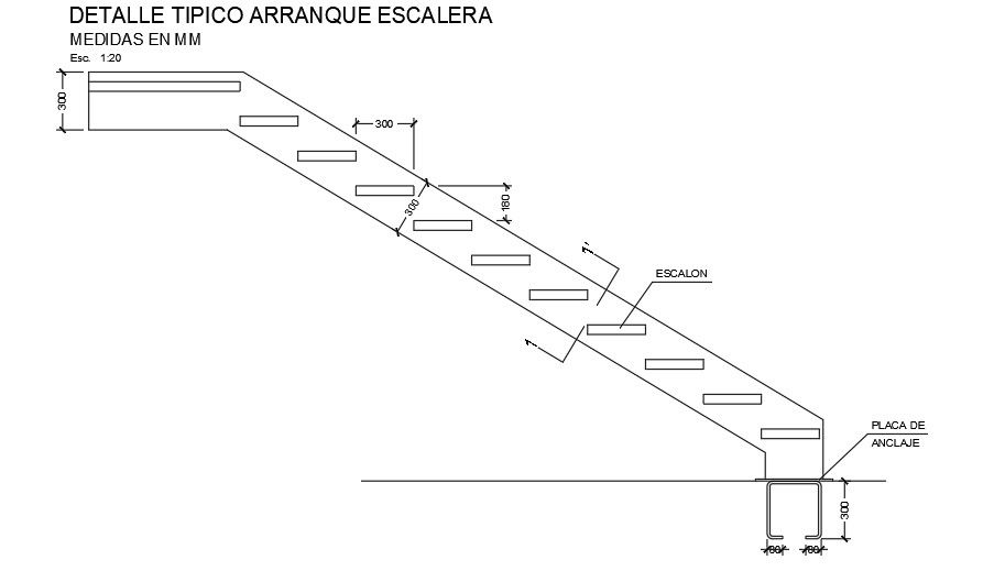 The typical detail of starting staircase side elevation drawing that shows 300mmX180mm trade and rise with measurements detail in mm format. the load factors also account for variability in the