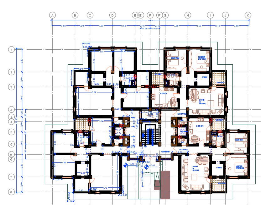 The architecture residence apartment layout plan AutoCAD drawing includes 4 unit houses on the cluster floor plan which consist of 2 bedrooms, storerooms, kitchen, dining area, drawing room, and balcony with all dimension detail and centre line plan. there is a total 700 square meter plot size and column layout plan in dwg file. Thank you for downloading the AutoCAD drawing file and other CAD program files from our website.