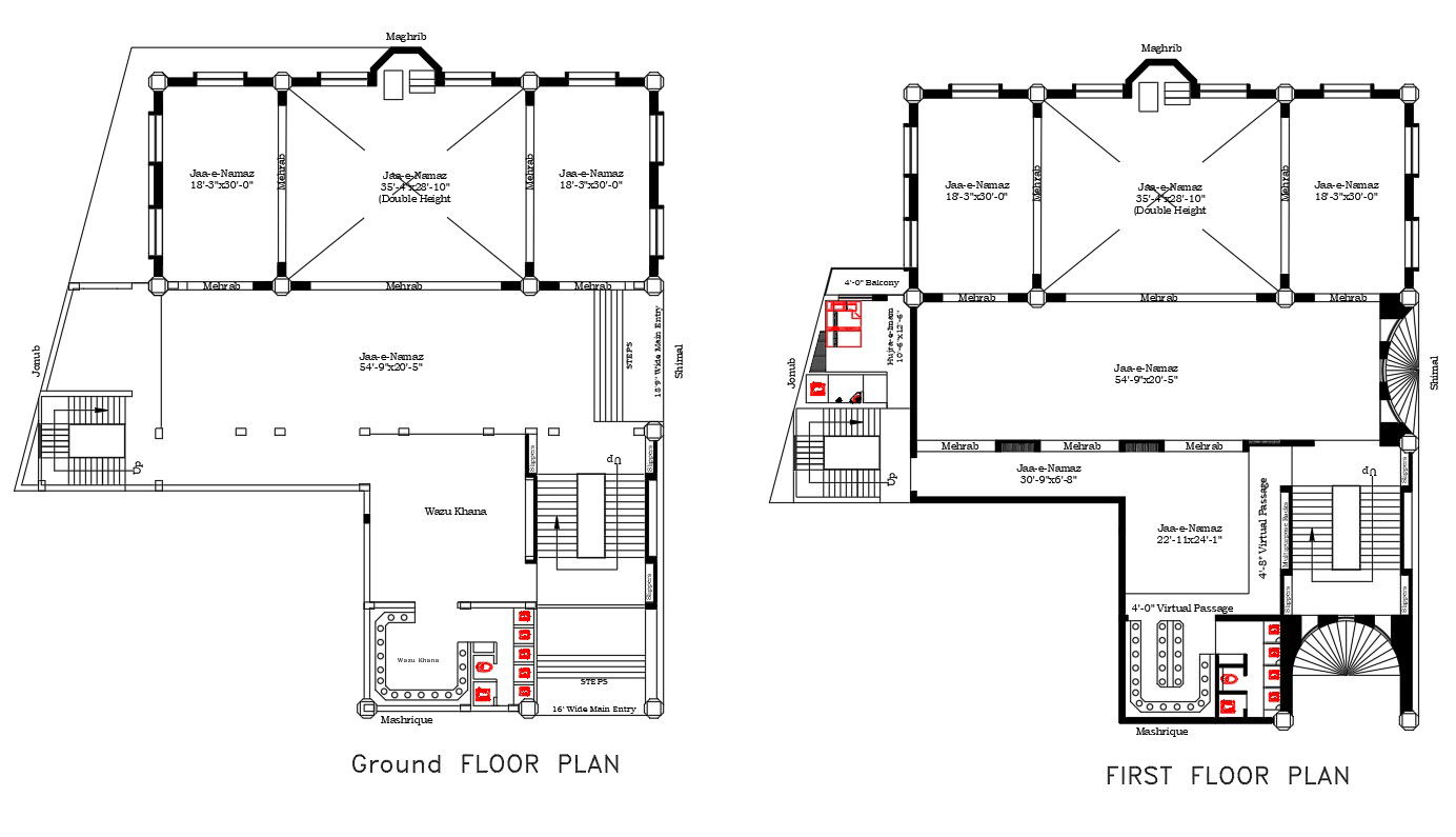 It’s a autocad mosque plan (1476 Sq.ft.) It’s a conceptual ground floor mosque plan and first floor plan with stair details and Direction of West.