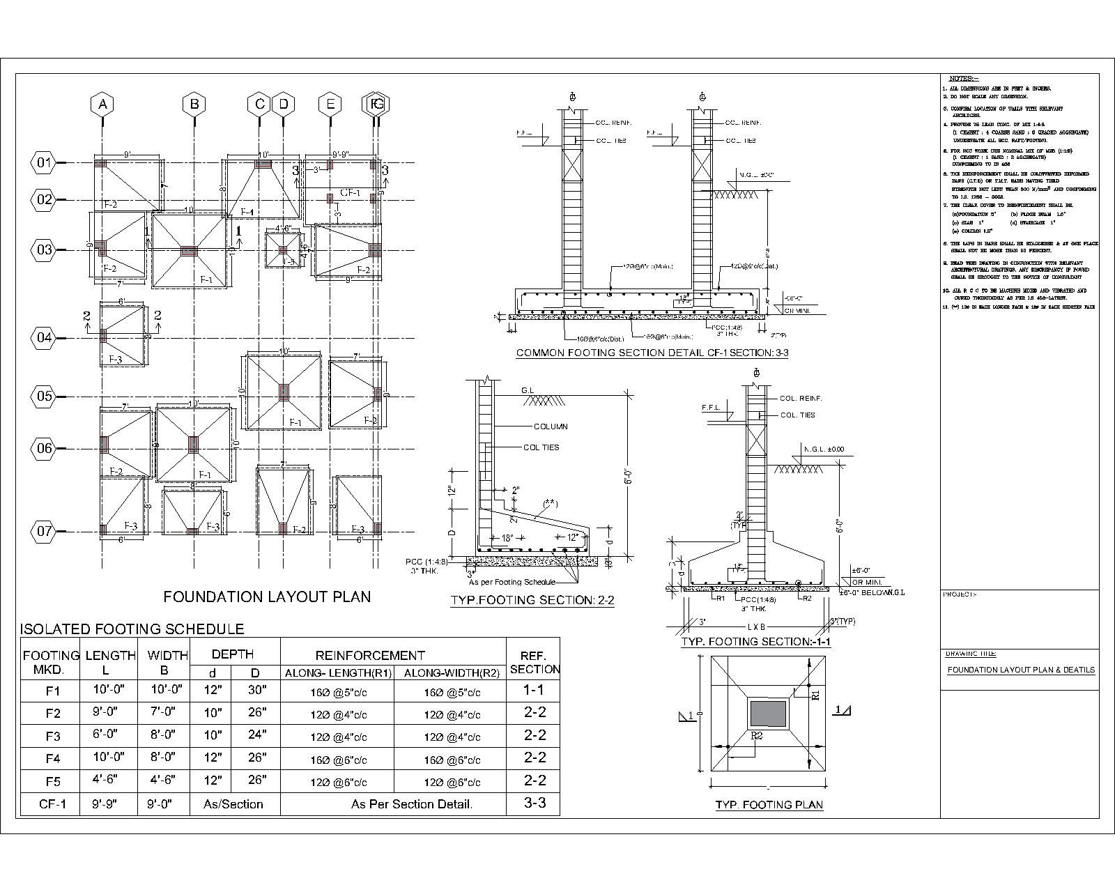 Foundation layout plan with grid marking and complete section details with footing schedule with bar details as per footing load of building. the reinforcement shall be c0ldtwisted deformed bars (c.t.d) or t.m.t. bars having yield strength not less than 500 n/mm and conforming