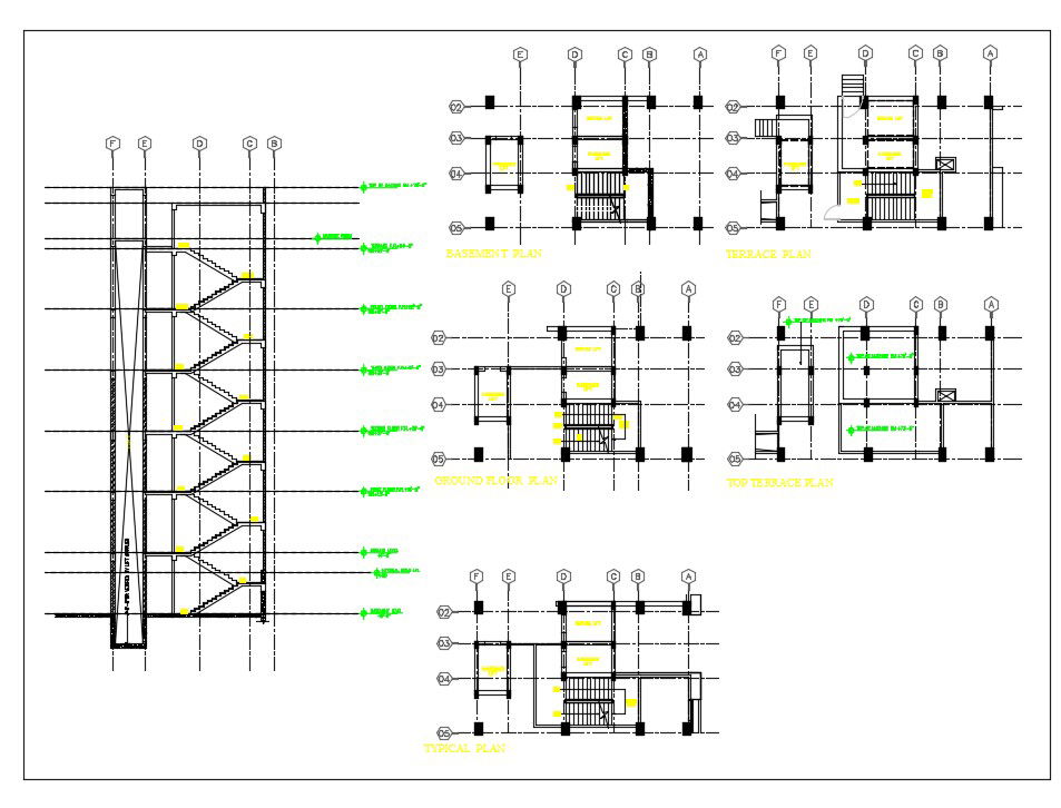 It is a stair and lift section drawing of floor by floor as per architect Plan & Section of Stair & Lift Basement to Fourth Floor to Terrace & Machine Room. this drawing shall be read in conjunction with the general arrangement/building plan.
