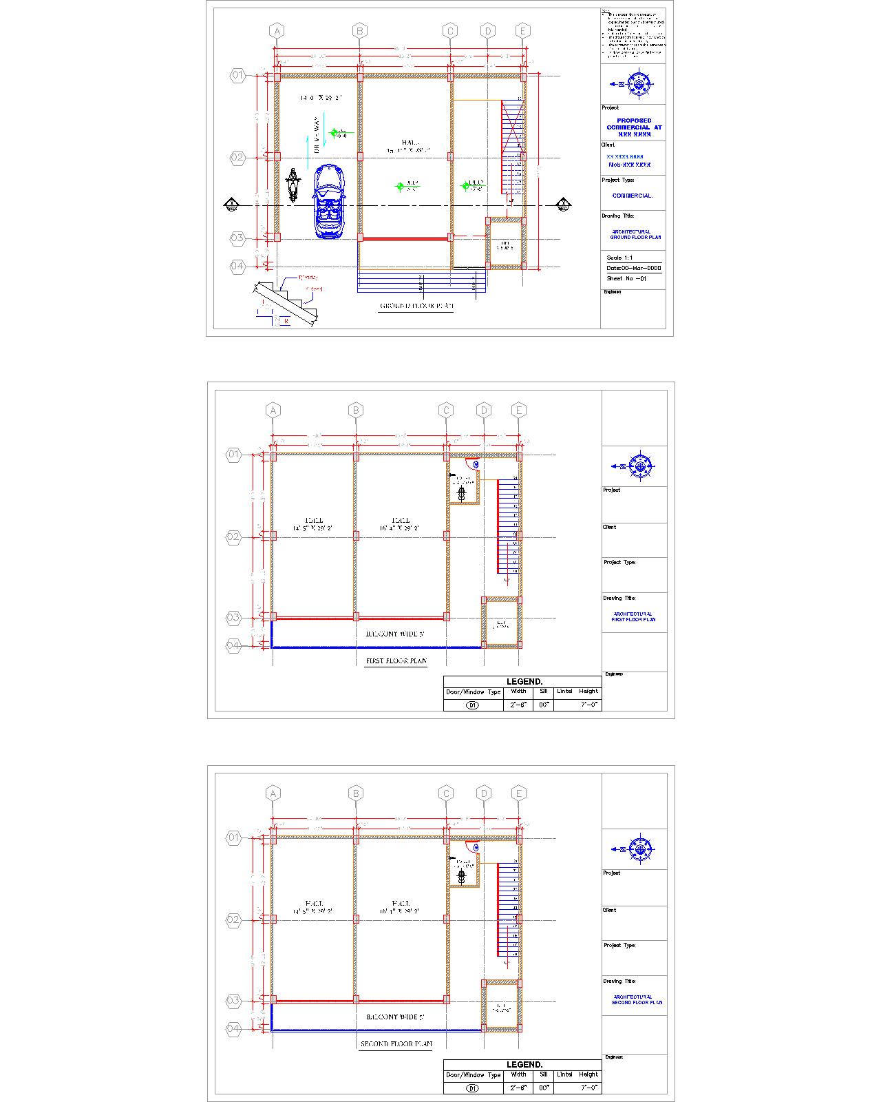 its a architectural plan details 45'X35'. its a commercial plan of as per architect ground, first and second floor plan details. also has column layout with all dimension detail in dwg file.