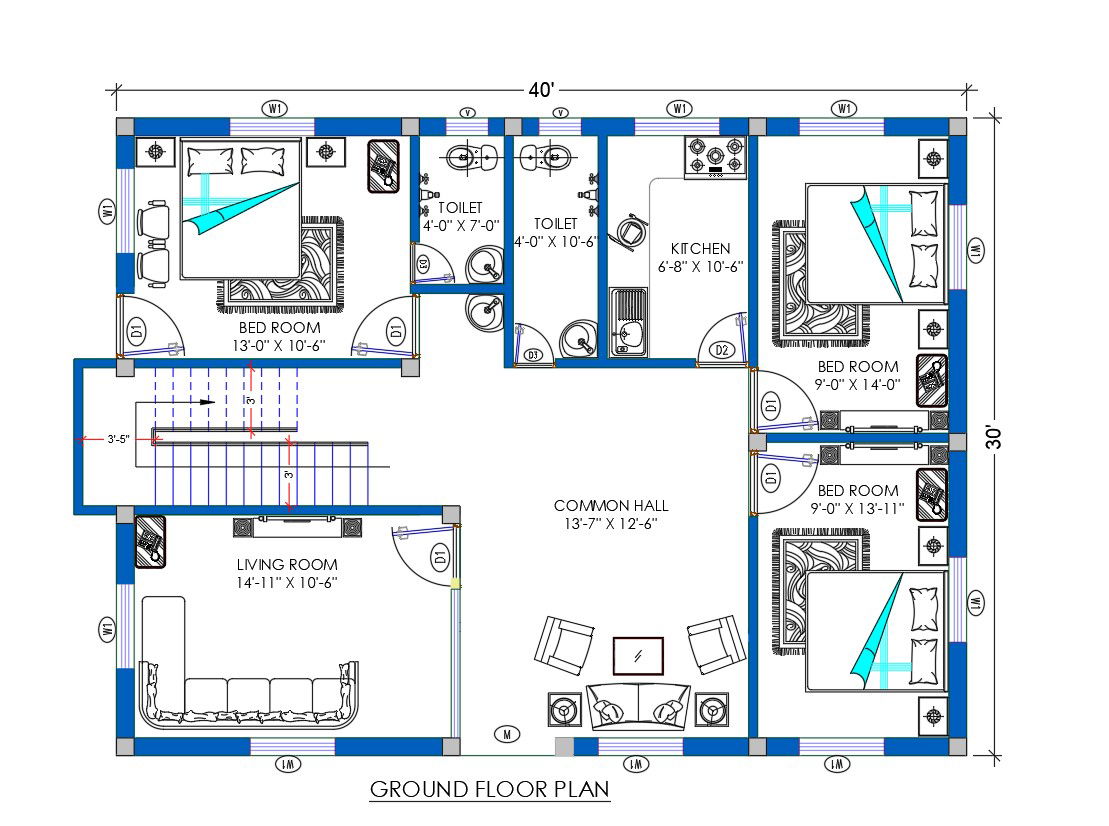 The residence house ground floor plan CAD drawing shows 40'X30' plot size which consist 3 bedrooms, kitchen, living room, hall, inside staircase, with `door window marking and furniture layout design in dwg file. Thank you for downloading the AutoCAD drawing file and other CAD program files from our website.