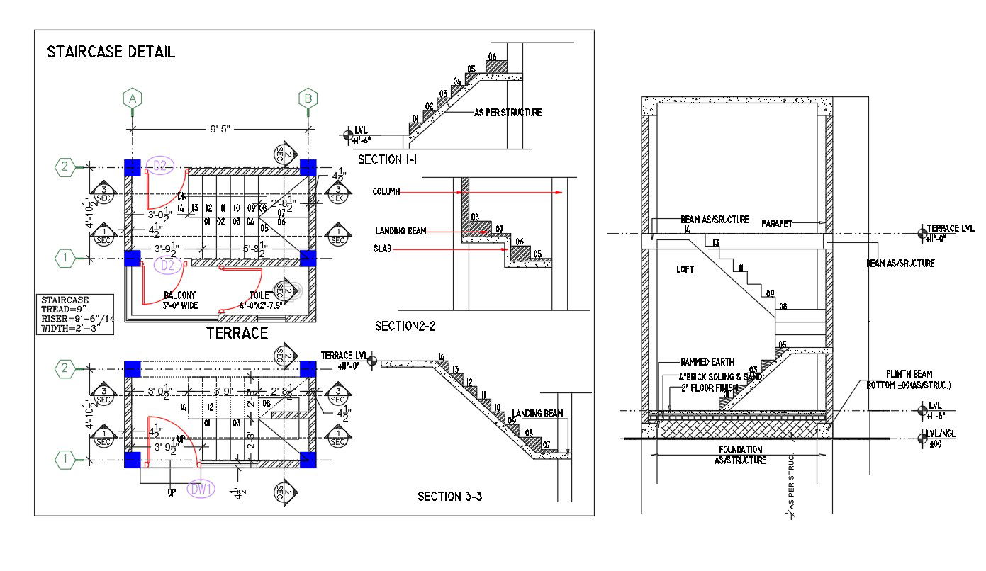 The staircase plan and section CAD drawing shows tread and riser 9"X9'-6" with total width size is 2'-3" survey and deliver a schematic showing the details. the depth position and the size of the underground structure column and landing beam detail in dwg file. Thank you for downloading the AutoCAD drawing file and other CAD program files from our website.