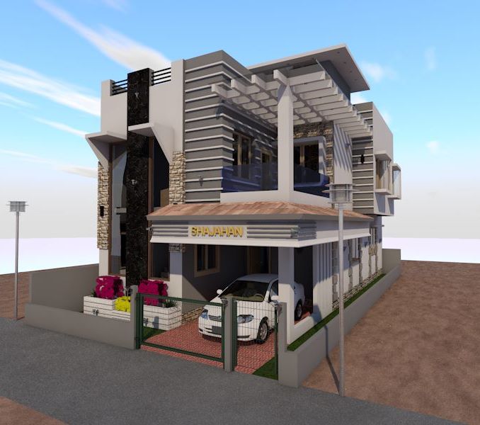 The modern house ground floor and first floor plan drawing shows bedrooms, kitchen, dining area, living room, drawing room and car parking porch. also has render image for visualization the the project. download free modern house plan drawing pdf file.