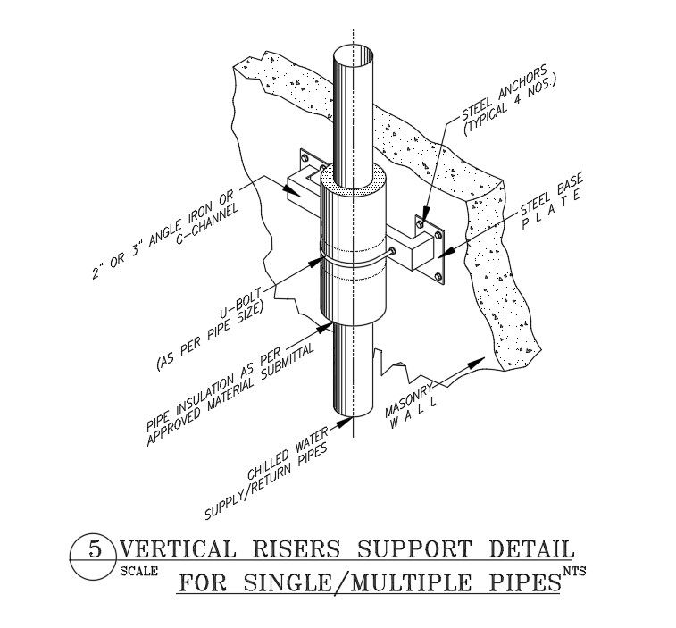 The water piping typical section CAD drawing shows vertical risers support detail for single/multiple pipes, pipe insulation as per approved material submittal, approved material submittal 2" or 3" angle iron or channel drawing dwg file. Thank you so much for downloading the DWG file from our website.