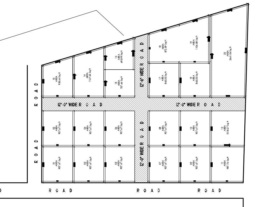 It’s a plot dimension dwg file. Whole plot divided with 20 plots for sale purpose and own 4 way 12’ wide Road and government road in 2 Side of Plot.