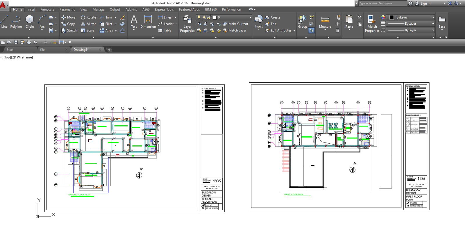 AutoCAD working drawing of a bungalow. This drawing has ground and first floor plans. Dwg file and can be used for real construction. Thank you.