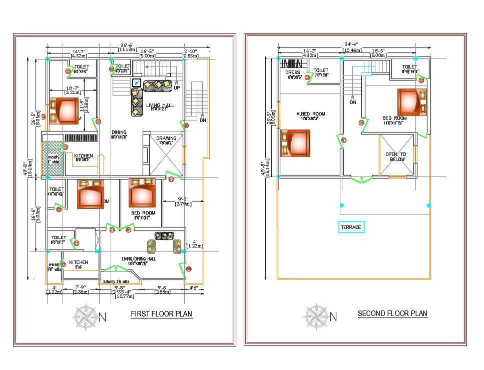 The AutoCAD drawings House plan are designed by an architect which consists of the ground floor plan and first-floor plan shows 2 BHK and 3 BHK plan with furniture layout and all dimension detail. The architectural drawings reflect changes as per plot size and requirement during the construction process. Thank you for downloading the AutoCAD drawing file and other CAD program files from our website.