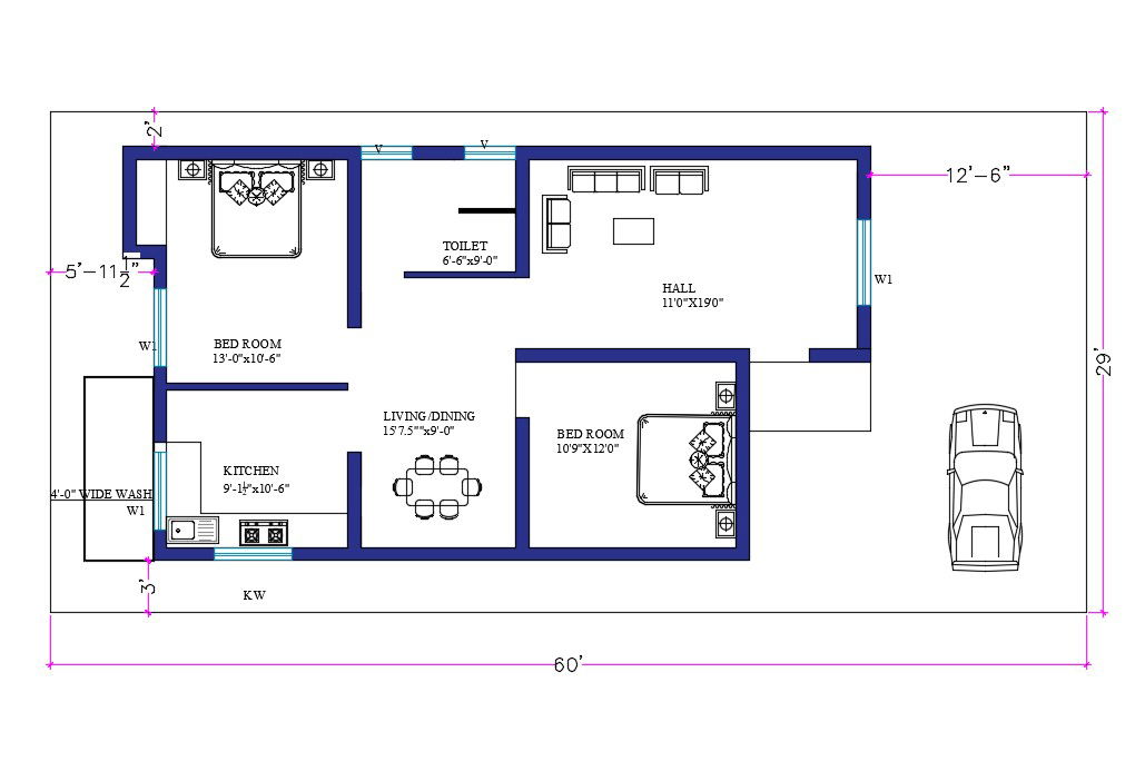 60X30 Ft House Layout Plan AutoCAD Drawing DWG File