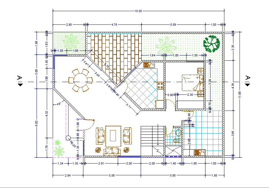 The residence house layout plan CAD drawing shows 15x11 meter plot size with all dimension detail, The house plan includes 1 bedroom, dining area, living room, kitchen and garden detail with furniture in dwg file. Thank you for downloading the AutoCAD drawing file and other CAD program files from our website.