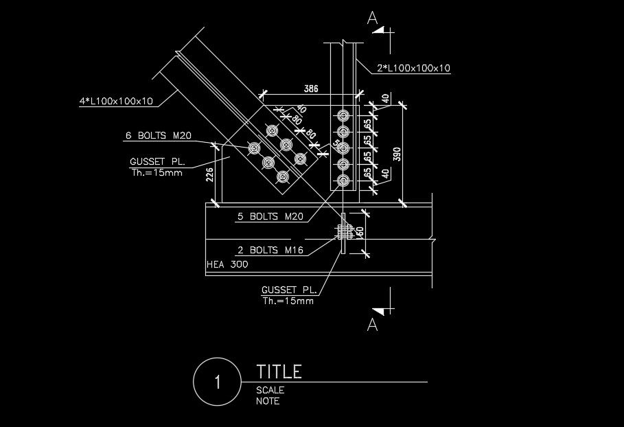 Gusset plate detail drawing is given in this AutoCAD drawing model. Thickness of the gusset plate is 15mm. M20 bolts are used for connections. For more details download the AutoCAD files for free from our website.
