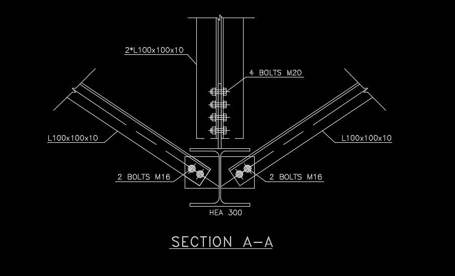 A section view of the two side gusset plate detail drawing is given in this AutoCAD drawing model. HEA 300 channel is provided. 4 numbers of M20 bolts are used. 100x100x10mm channel is provided. For more details download the AutoCAD files for free from our website.