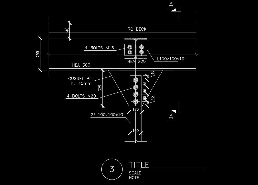 RC deck detail drawing is given in this AutoCAD drawing model. HEA 200 channel is provided. 4 numbers of M20 bolts are used. 100x100x10mm channel is provided. For more details download the AutoCAD files for free from our website.
