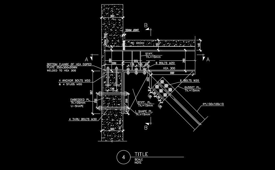 Anchor bolt and flange connection details are given for the 246x245m industrial plan in this AutoCAD. 25mm joint is provided. M20 bolts are used. 100x100x10mm channel section is provided. For more details download the AutoCAD files for free from our website.