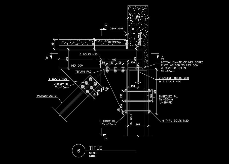 Splice and bolt joints detail drawing is given in this AutoCAD model. HEA 300 channel is provided. 6 numbers of M20 bolts are used. Teflon pad is provided for the bolts. For more details download the AutoCAD files for free from our website.