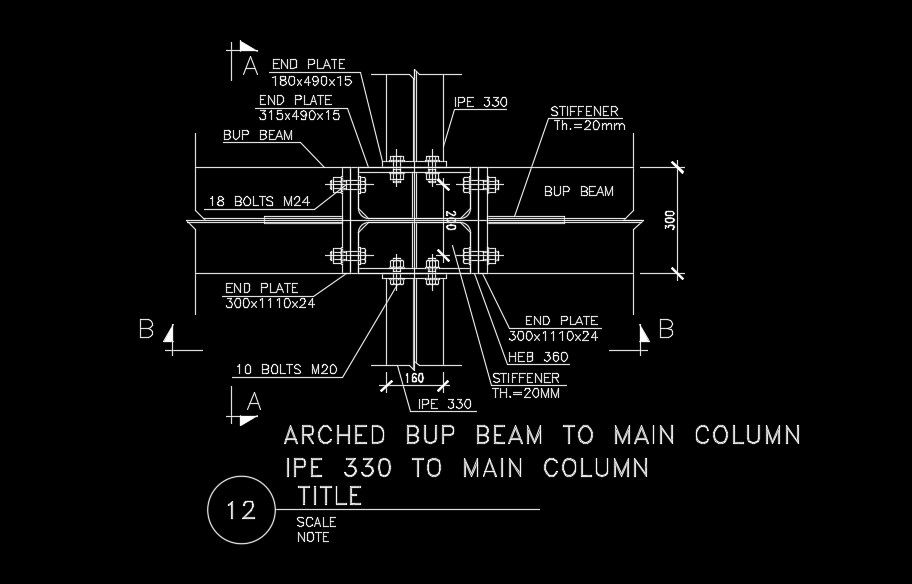 Arched bup beam to main column detail drawing is given in this AutoCAD drawing model. IPE 330 channel is provided to the main column. For more details download the AutoCAD files for free from our website.