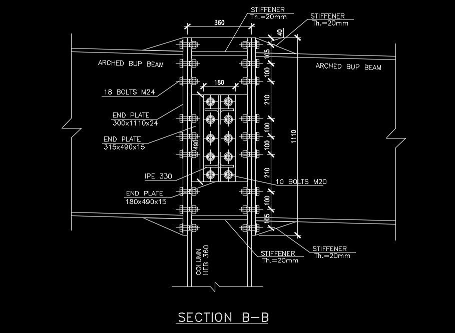The back side section view of the arched bup beam to main column detail drawing is given in this AutoCAD drawing model. IPE 330 channel is provided to the main column. For more details download the AutoCAD files for free from our website.