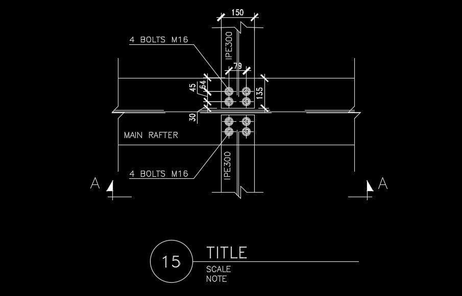 Main rafter detail drawing is given in this AutoCAD drawing model. 4 numbers of M16 bolts are provided. IPE 300 channel is used in this drawing. For more details download the AutoCAD files for free from our website.
