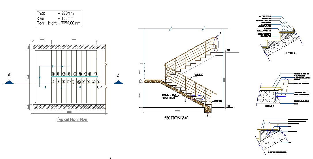 4000x3000 MM staircase Plan Layout shown in AutoCAD File. The typical detail of starting staircase side elevation drawing that shows 270mmX150mm trade and rise with measurements detail in mm format. Staircase elevation, section, and detail drawing are available in this AutoCAD File. the load factors also account for variability in the structural analysis used to compute moments and stairs in the dwg file. Thank you for downloading the AutoCAD drawing file and other CAD program files from our website.