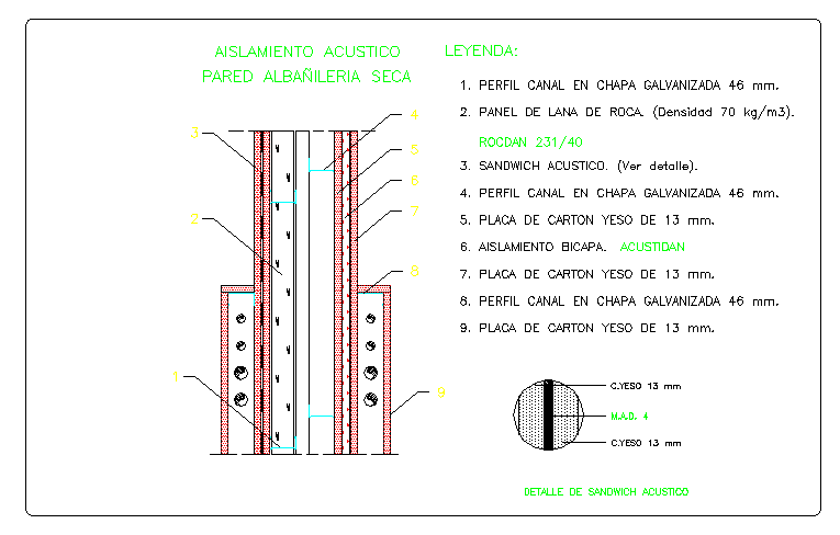 ROCK WOOL PANEL. (Density 70 kg / m3)., CHANNEL PROFILE IN GALVANIZED SHEET 46 mm., CARDBOARD PLATE OF 13 mm., C.YESO 13 mm.