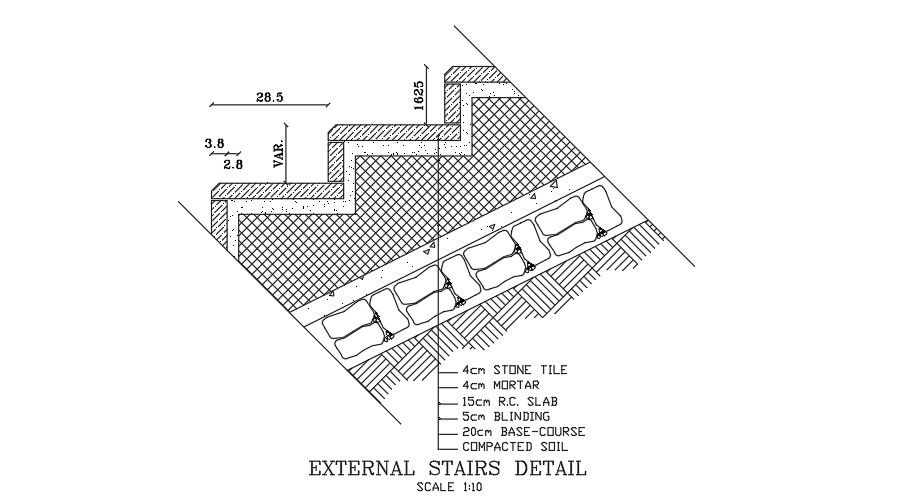 External Stair section detail cad drawing is given in this cad file. There is a 2d side view and section details are available. The stair section shows RCC detail includes 4 cm stone tile, 4 cm mortar, 15 cm RC slab, 5 cm blinding, 20 cm base-course and compacted soil. For more 3d or 2d stair, case designs visit our website cadbull.com. Download this 2d cad file now.