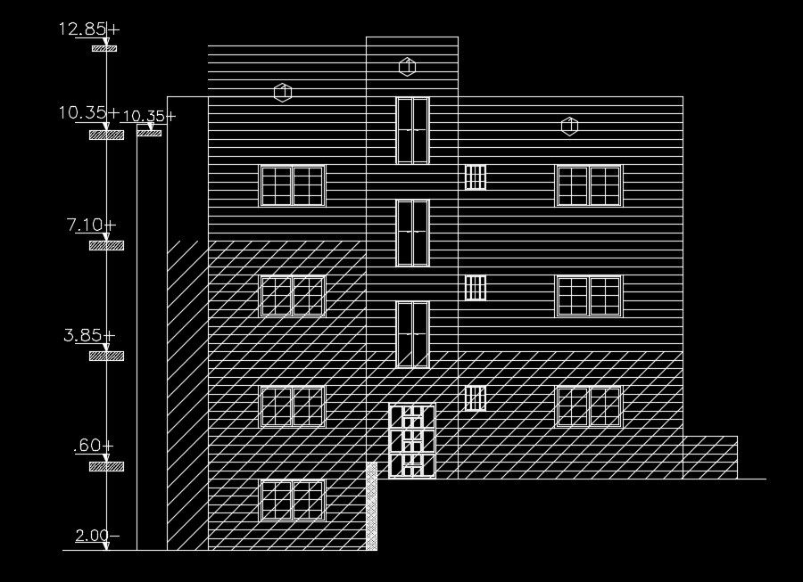 The back side elevation view of the 15x16m school building drawing is given in this AutoCAD file. The total height of the building is 12.85m. On this left side elevation view, doors, and windows are visible. For more details download the AutoCAD file.