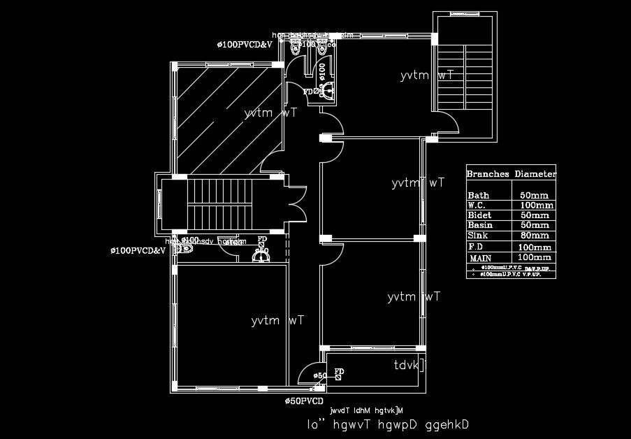 15x16m ground school plan of pipeline detail drawing is given in this AutoCAD model. Bath pipe, bidet, and basin diameter are 50mm. Water closet, FD, and Main pipe diameters are 100mm. The sink pipe dia is 80mm. For more details download the AutoCAD file.