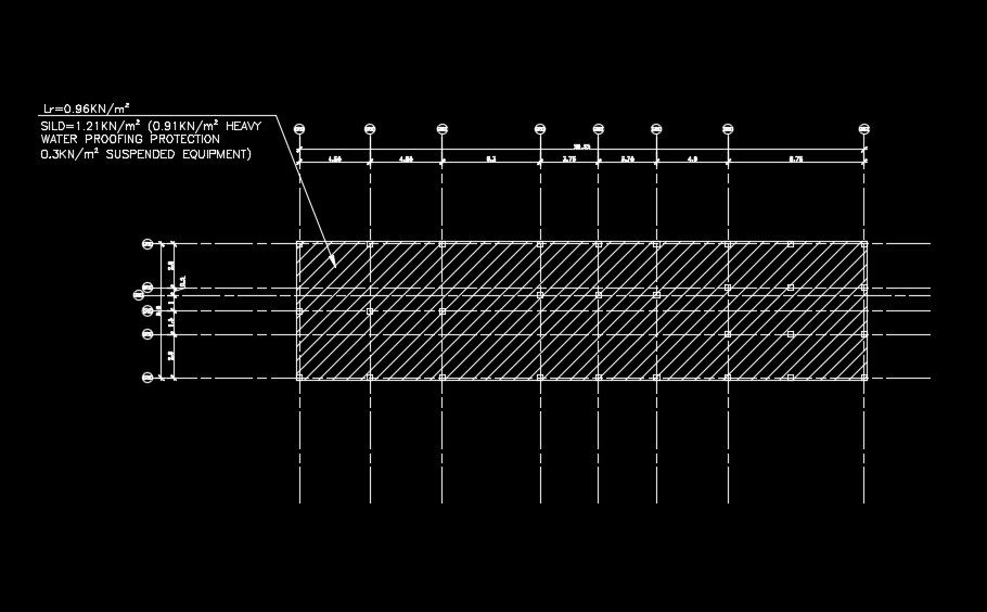 36x9m length of the slab is given in this AutoCAD drawing model. This is provided for the 50x32m industrial plan. Heavy water proof protection is provided on this slab. For more details download the AutoCAD files for free.