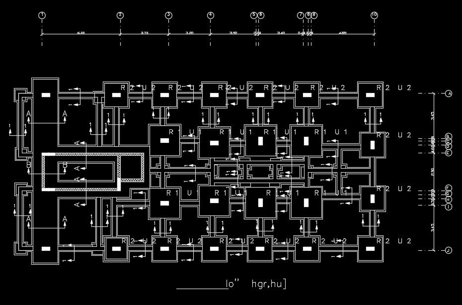The foundation layout of the 27x12m twin house plan AutoCAD drawing model is given in this file