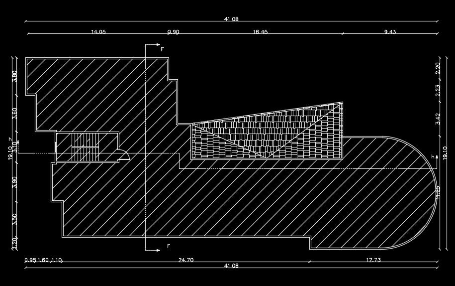 The roof layout of the 41x19m house plan is given in this AutoCAD drawing model. The height of the building is 4.25m. 3 houses are available on this plan. Each house consists of the kitchen, living room, dining area, master bedroom with the attached toilet, kid’s room, guest room, and common bathroom.