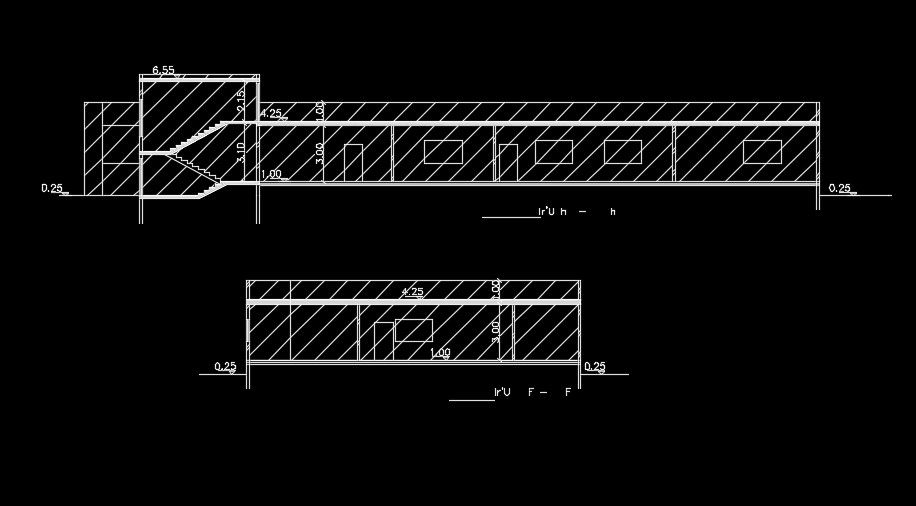 The right side section view of the 41x19m single floor house building is given in this AutoCAD drawing model. The height of the building is 4.25m. 3 houses are available on this plan. Each house consists of the kitchen, living room, dining area, master bedroom with the attached toilet, kid’s room, guest room, and common bathroom.
