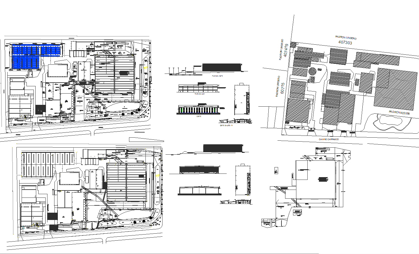 Galpon architecture design and detail in autocad dwg files. Include floor plan, elevations, sections and detail of constructions.
