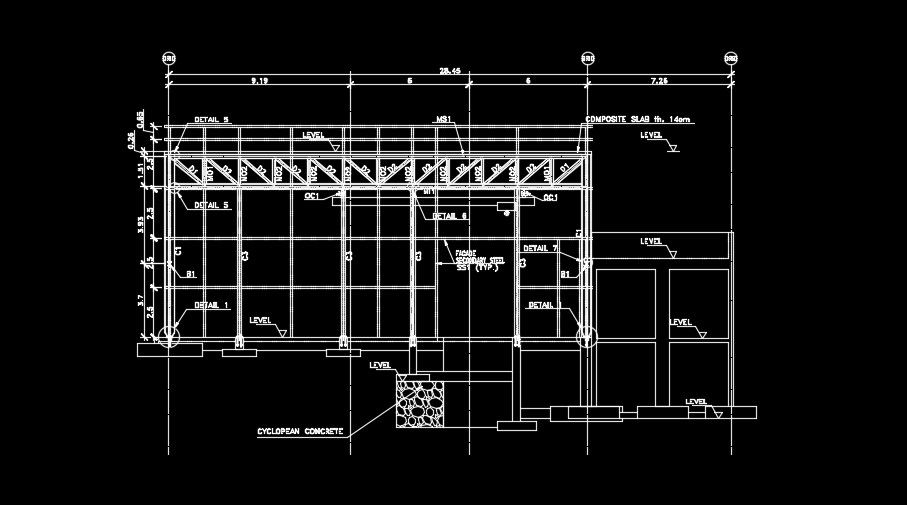 The back side section view of the 28x12 industrial plan of the column view is given in this AutoCAD drawing model. The thickness of the composite slab is 140mm. The channel section details are given which is used for the column. For more details download the AutoCAD drawing model.