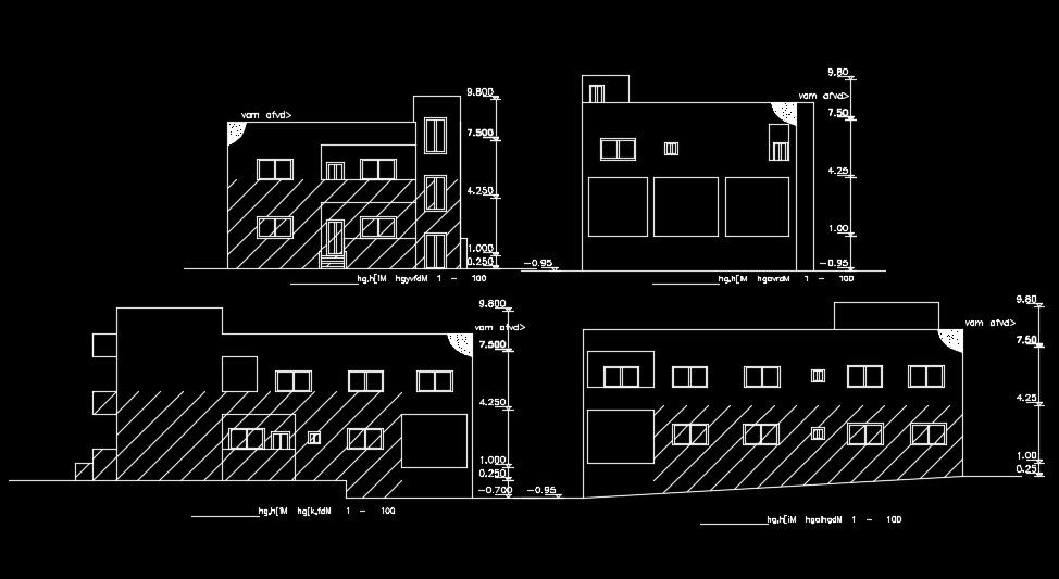 An elevation view of the 22x13m house building is given in this AutoCAD drawing model. The living room, kitchen, two kid’s room, guest room, master bedroom, and two common bathrooms are available on this plan. For more details download the AutoCAD drawing file for free.