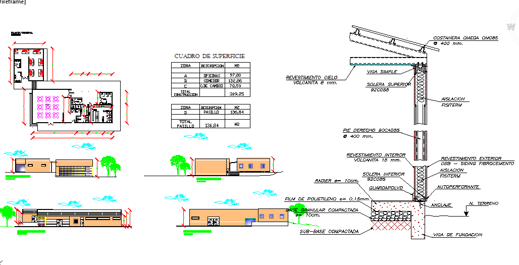 Government Office Project detail in plan & Section & elevation Detail, Sky coating, volcanita 8 mm. polyethylene film and = 0.15mm., Structure detail.