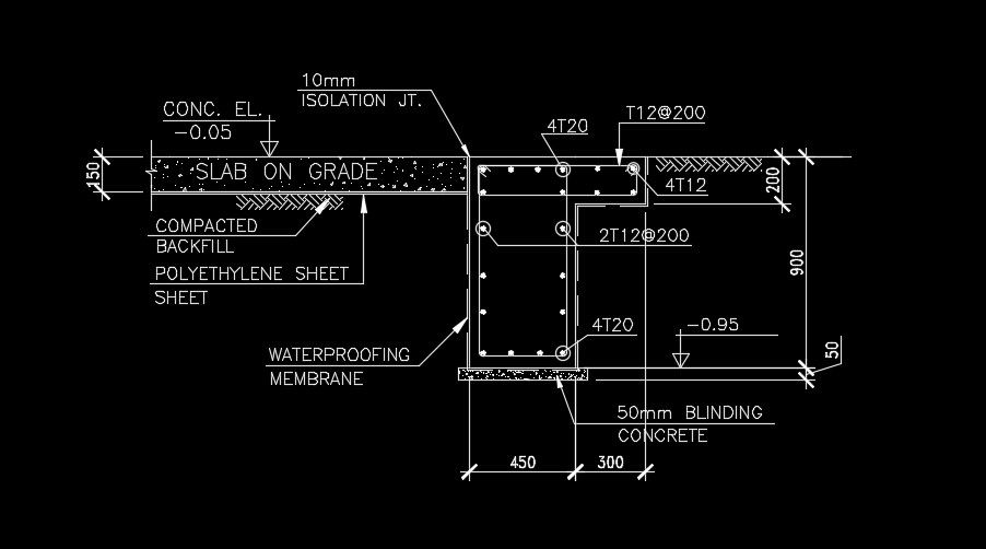 Column cum slab reinforcement detail plan is given in this AutoCAD drawing model. The thickness of the slab is 150mm. Column wall, expansion joint, water proofing membrane, and polyethylene sheets are mentioned clearly in this drawing. For more details download the AutoCAD drawing model.