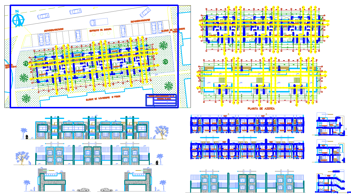 Single story rowhouse Architecture plan and detail in autocad dwg files.