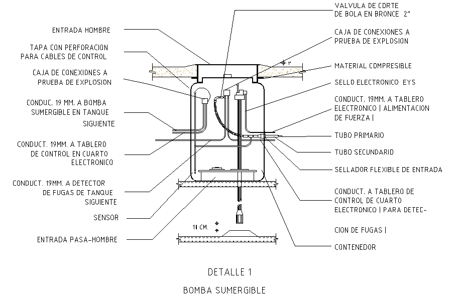 Man entrance, Entrance pass man, Conduct. 19mm. To next tank leak detector, Cap with perforation for control cables etc detail in drawing.